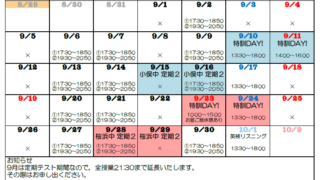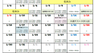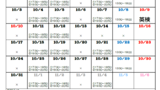 いっぽ 11月の予定です こんばんは,11月の予定です。11月は,中学生は定期テスト3があり,また,大学受験生にとっては,模試の嵐!ガンガン精神が削られていく,とってもつらい月です。でも,だからこそ,この月を乗り越えられれば,強くなれます。みんなで一緒に乗り越えてい... 2022.10.18 いっぽ予定表