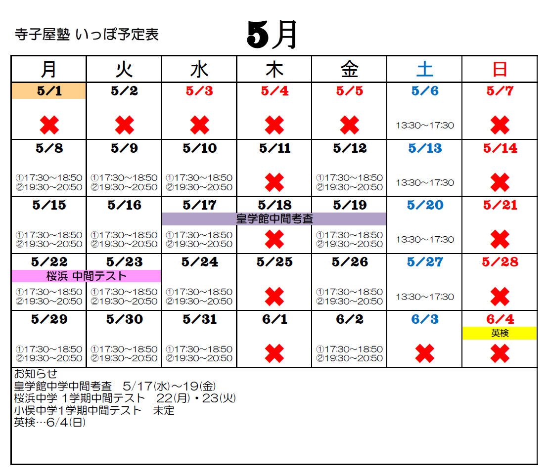 皆さんこんにちは、5月の予定です。